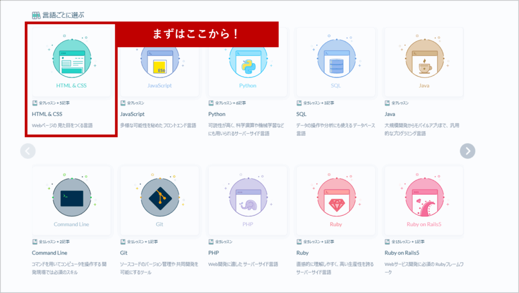 コース一覧を確認します。様々な言語がありますが、まずはWeb制作の基本である「HTML & CSS」から始めてみるのがおすすめです。
