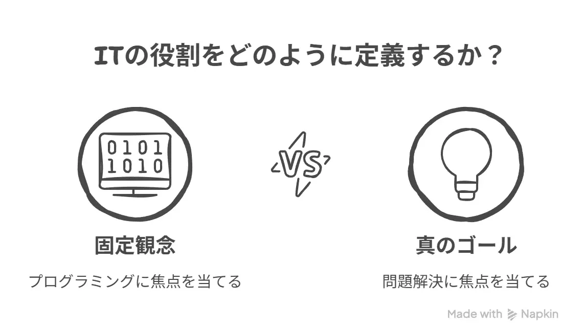 多くの人が、「ITエンジニア = プログラミングをする人」という固定観念に縛られています。 しかし、ITの世界における本当のゴールは、コードを書くことではなく「ITの力で、誰かの課題を解決する」ことです。