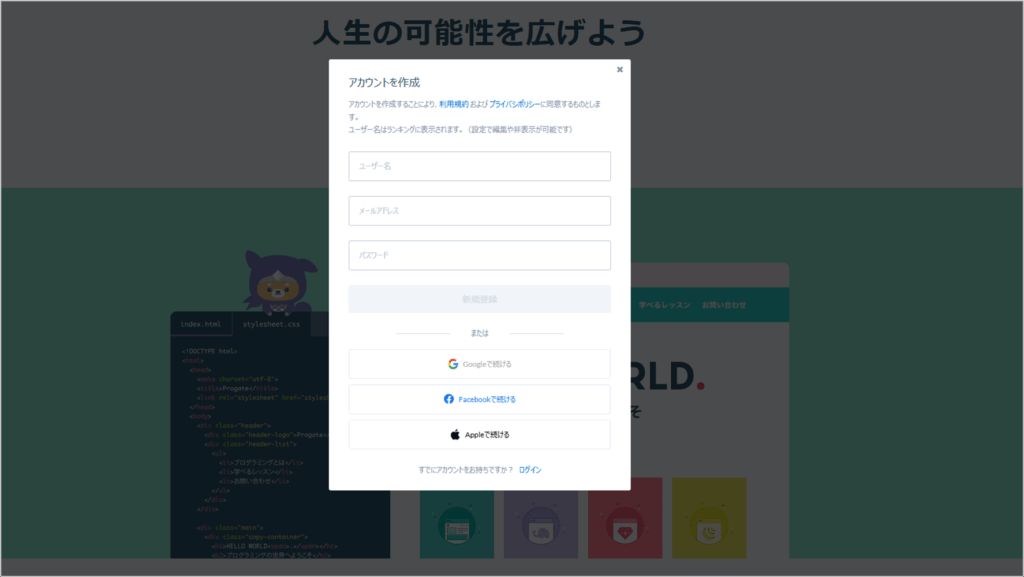 Progateの公式サイトにアクセスし、メールアドレスやSNSアカウントで簡単に無料登録します。