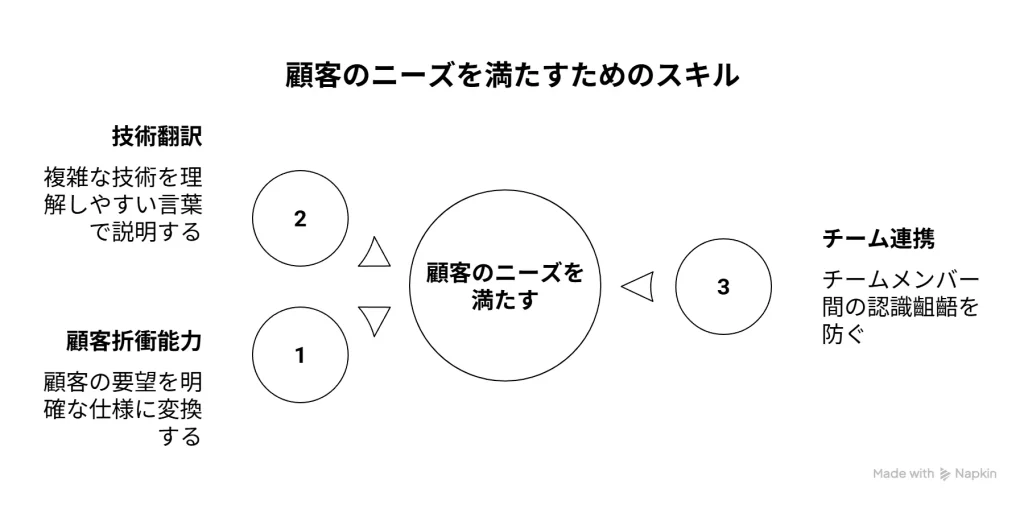 顧客が抱える漠然とした要望や課題を、丁寧なヒアリングを通じて引き出し、それを明確な「仕様」という形に落とし込む。これは、まさに営業で培われる「顧客折衝能力」そのものです。 - 技術を「翻訳」する力:
