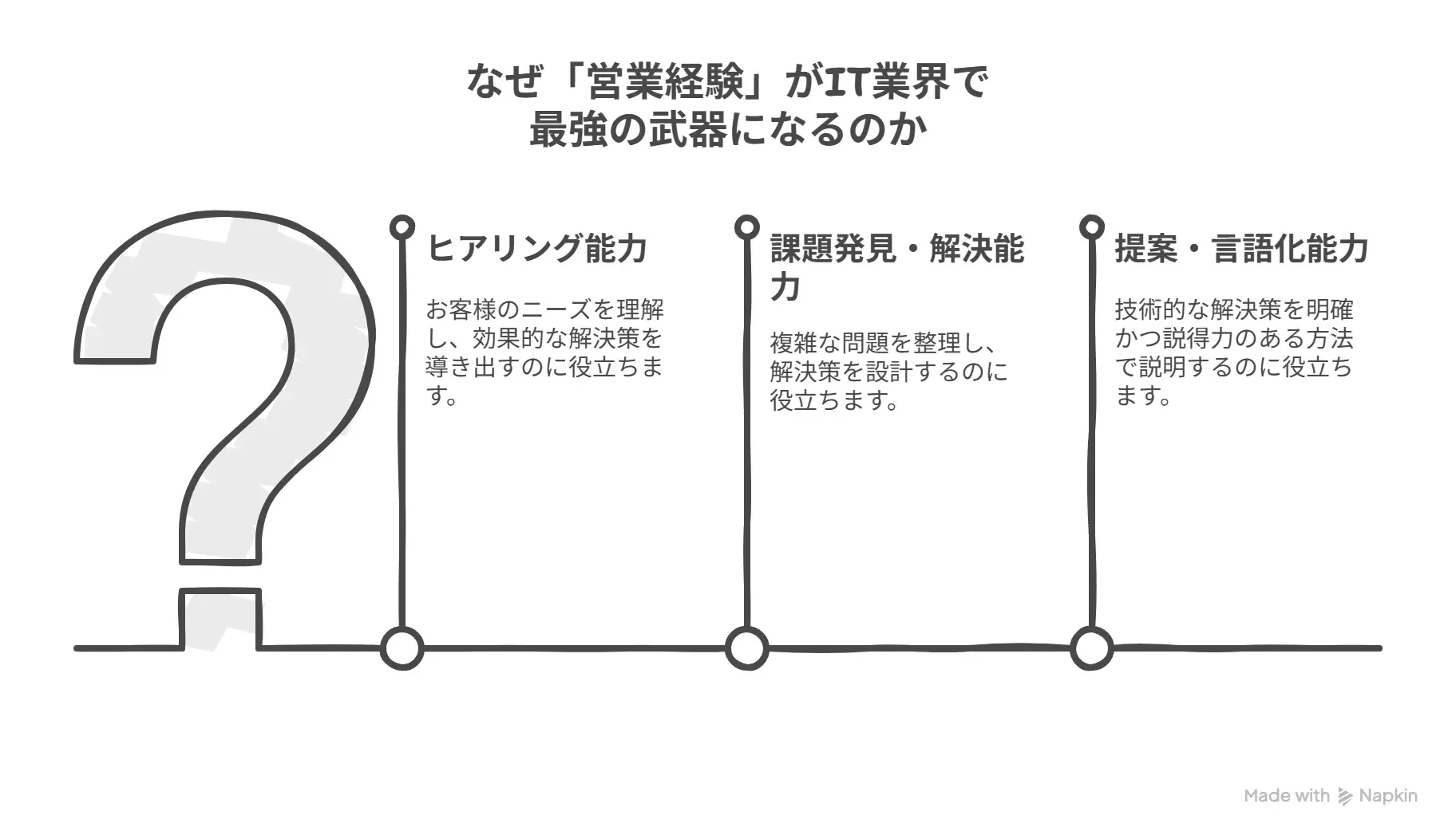 では、あなたが知るべき「1%の真実」とは何か。 それは、あなたの「営業経験」こそが、IT業界で最強の武器になる「戦場」を選びましょう、ということです。