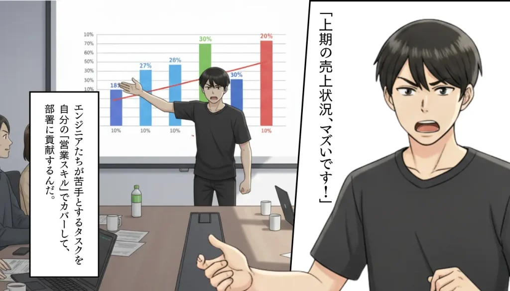 これが、私のエンジニア人生の「最初の一手」です。 私は、「レベル1のエンジニア」として萎縮するのではなく、 「レベル30の営業スキルを引き継いだ、レベル1のエンジニア」として、 エンジニアたちが苦手とするタスクを「営業スキル」でカバーし、部署に貢献することから始めたのです。