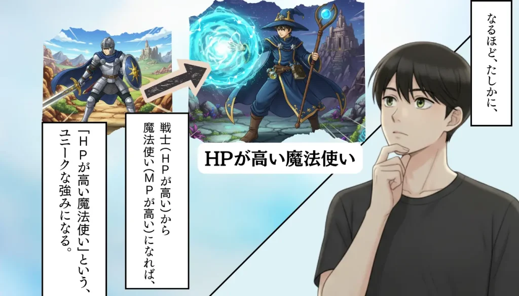 しかし、ここが重要です。 転職前の職業で覚えた「呪文」や「スキル」は、一定の条件で引き継げるのです。 さらに、戦士(HPが高い)から魔法使い(MPが高い)になれば、「HPが高い魔法使い」という、ユニークな強みを持った仲間が誕生します。